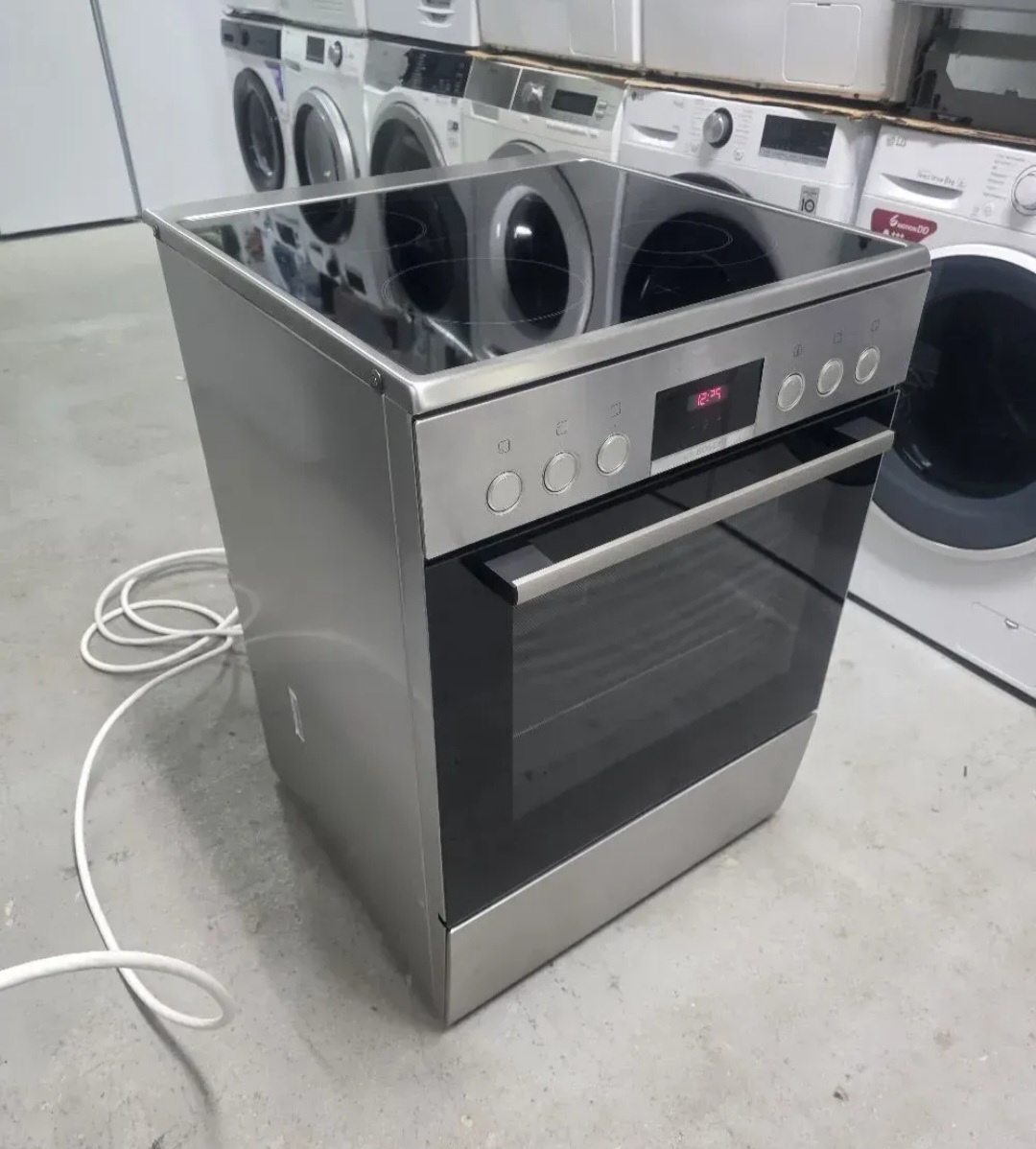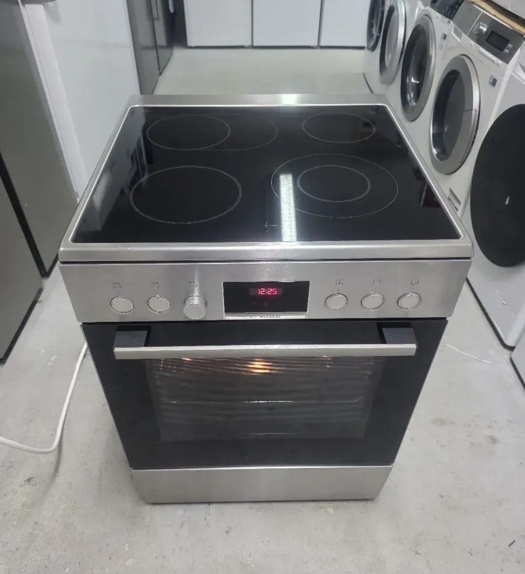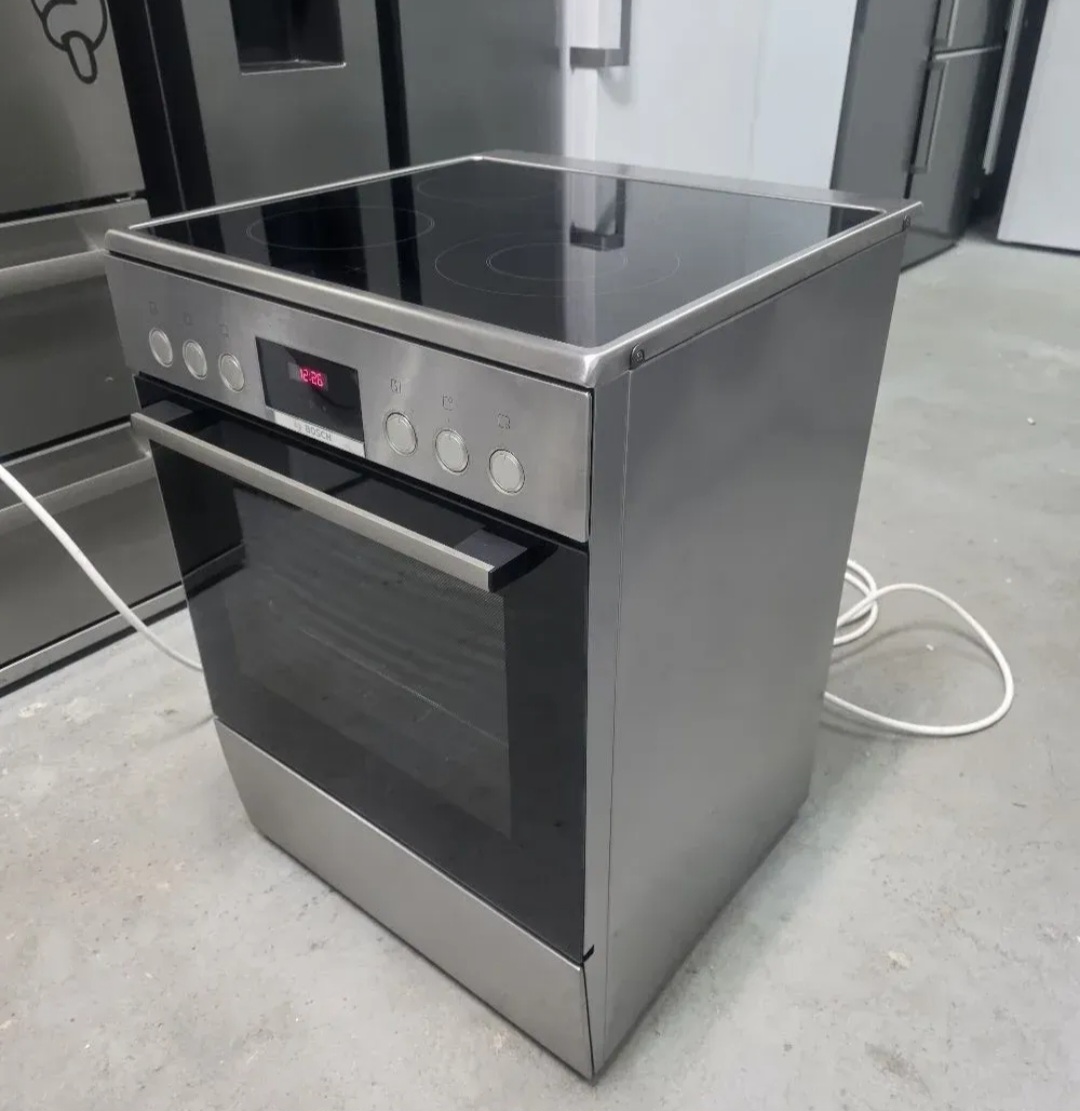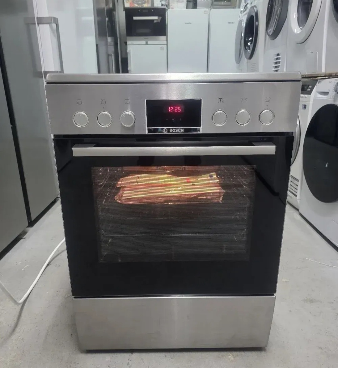 Potpuno nov, neotpakovan Bosch samostojeći električni šporet Serije 4. Inox dizajn, staklokeramička ploča, multifunkcionalna rerna sa 3D vrućim vazduhom i EcoClean Direct čišćenjem. Idealno rešenje za modernu kuhinju.