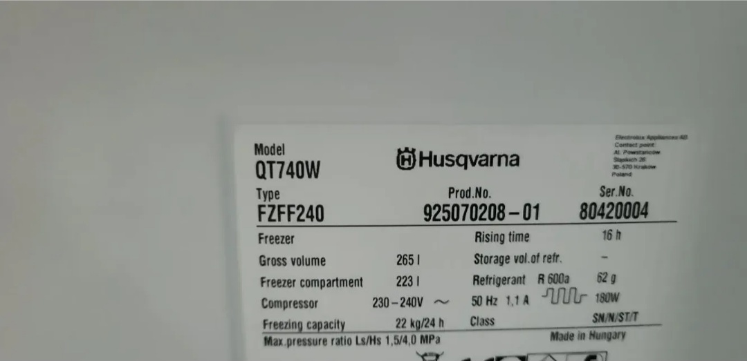 **Electrolux Husqvarna Zamrzivač (Model QT740W / FZFF240)**