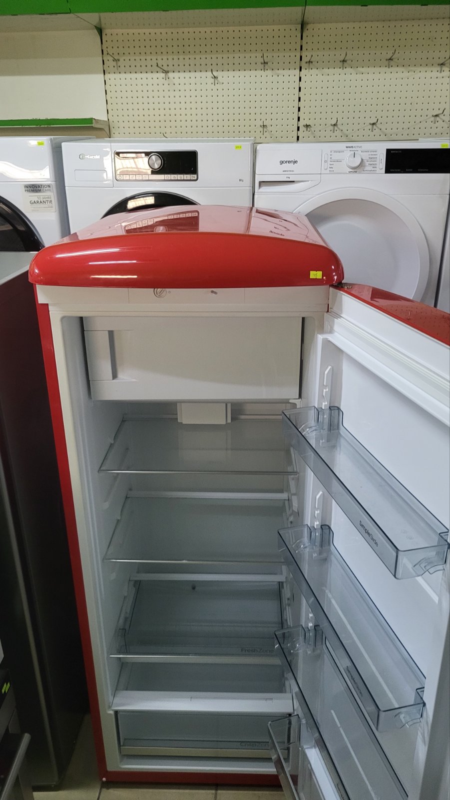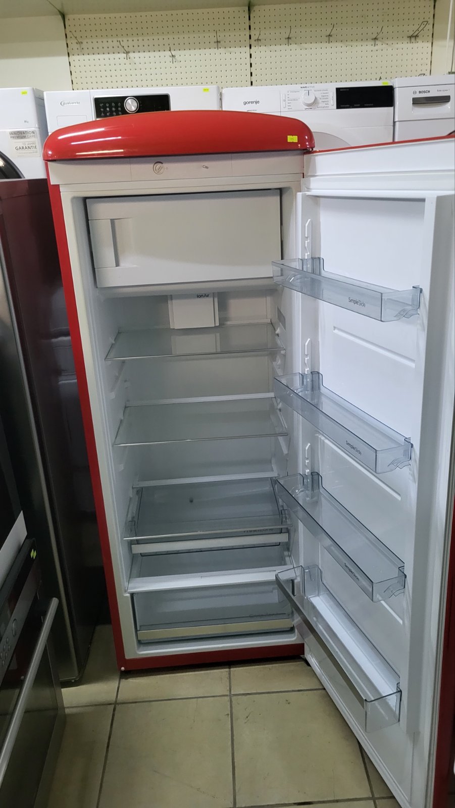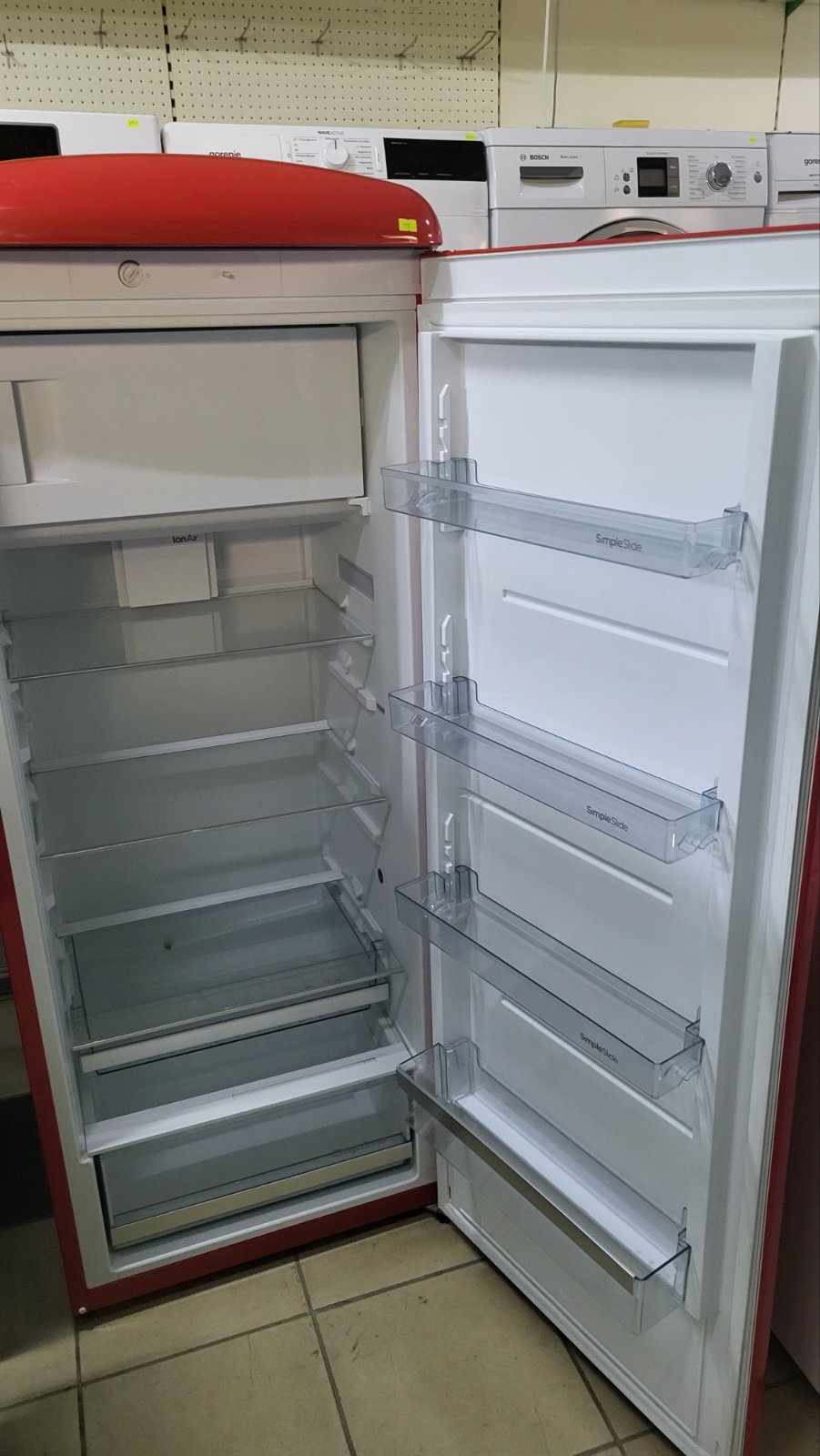 Unesite duh pedesetih u svoju kuhinju uz kultni Gorenje retro frižider u vatreno crvenoj boji. Ovaj model nije samo estetski dragulj, već i tehnološki napredan uređaj koji čuva svežinu vaših namirnica na najvišem nivou.Glavne karakteristike:•IonAir sa DynamicCooling sistemom: Napredna tehnologija koja simulira prirodni proces jonizacije kako bi hrana duže ostala sveža. Ravnomerna distribucija vazduha osigurava stabilnu temperaturu u celom frižideru.•CrispZone sa HumidityControl: Velika fioka za voće i povrće sa mogućnošću regulacije vlažnosti, idealna za očuvanje vitamina i hrskavosti.•FreshZone fioka: Poseban odeljak sa najnižom temperaturom u frižideru, savršen za meso, ribu i delikatesne proizvode.•SimpleSlide police: Inovativne police u vratima koje se lako pomeraju gore-dole, omogućavajući vam da smestite flaše bilo koje visine.•LED osvetljenje: Visokoefikasno i dugotrajno osvetljenje koje pruža odličnu preglednost unutrašnjosti.