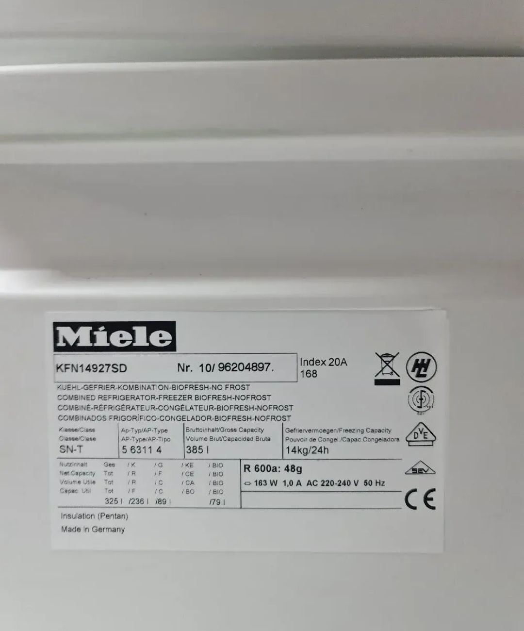 Kapaciteta 385 litara od kojih je zamrzivac 89 litara. Inverter, No frost, led osvetljenje, energetska klasa A+++, Perfect Fresh zona dve fioke, LED displej sa komandama na dodir, zasebno stelovanje temperatura frizidera i zamrzivaca, sarke sa amortizerima, sam privlaci i zatvara vrata, inox ojacanja na policama vrata i unutar frizidera.