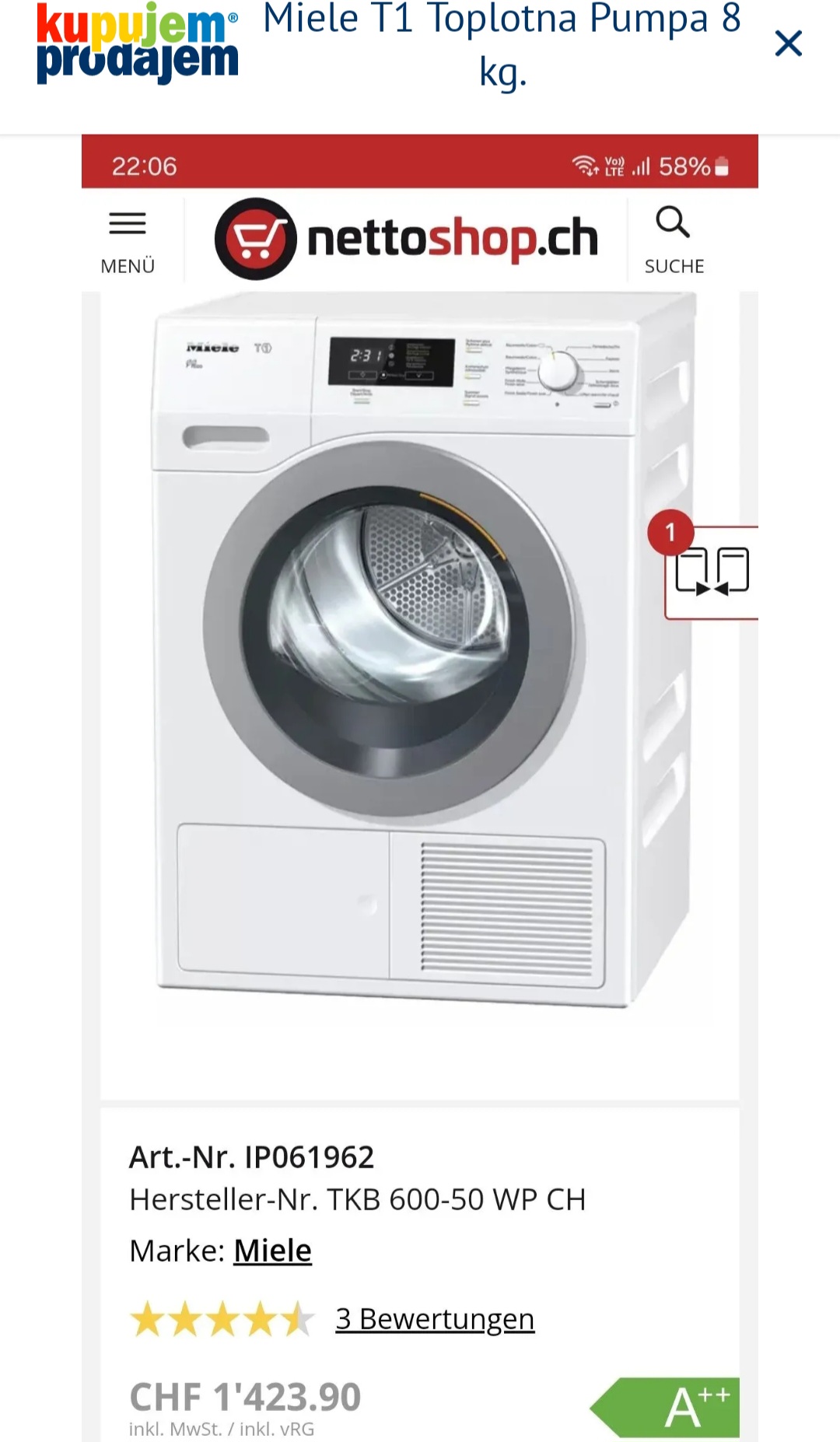 „Miele -T1“, polovna masina za susenje vesa, Toplotna Pumpa , 8 kg, LED, sace, garancija 6 meseci, moguc prevoz