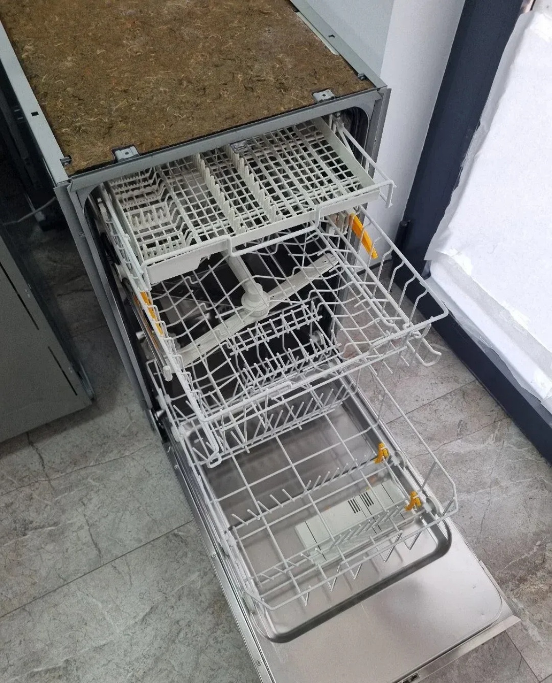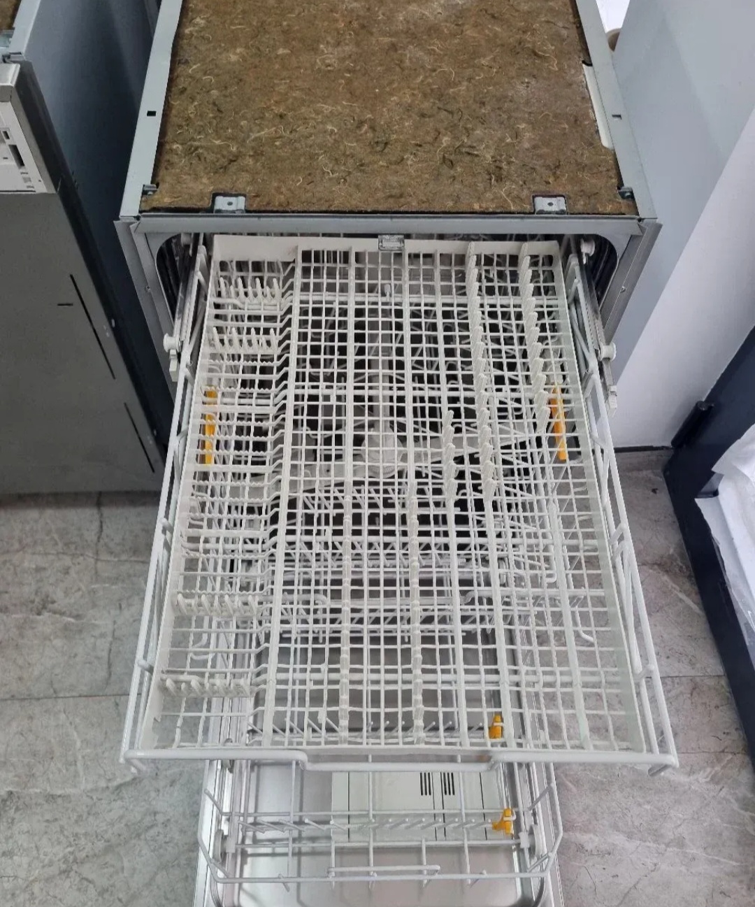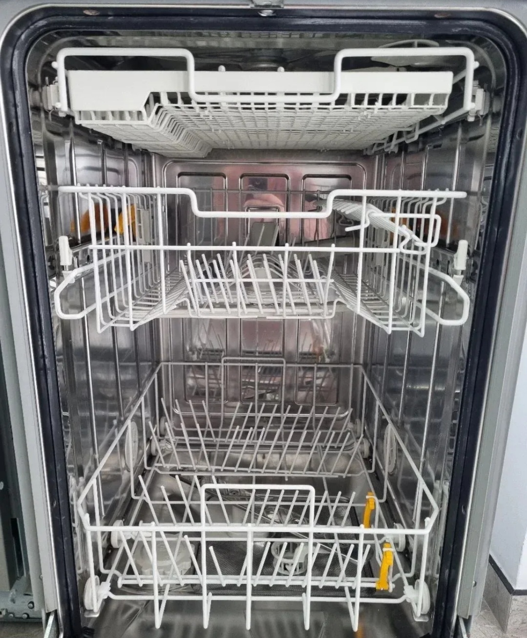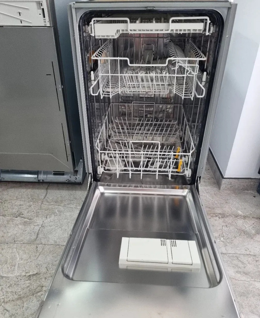 Polovna ugradna sudomašina vrhunskog nemačkog brenda „Miele“, širine 45 cm, idealna za moderne kuhinje gde je važan čist i uklopljen izgled bez vidljivih uređaja.