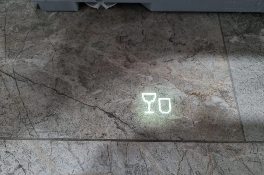 Displej sa prikazom preostalog vremena pranja sa laserom koji prenosi na podu kuhinje